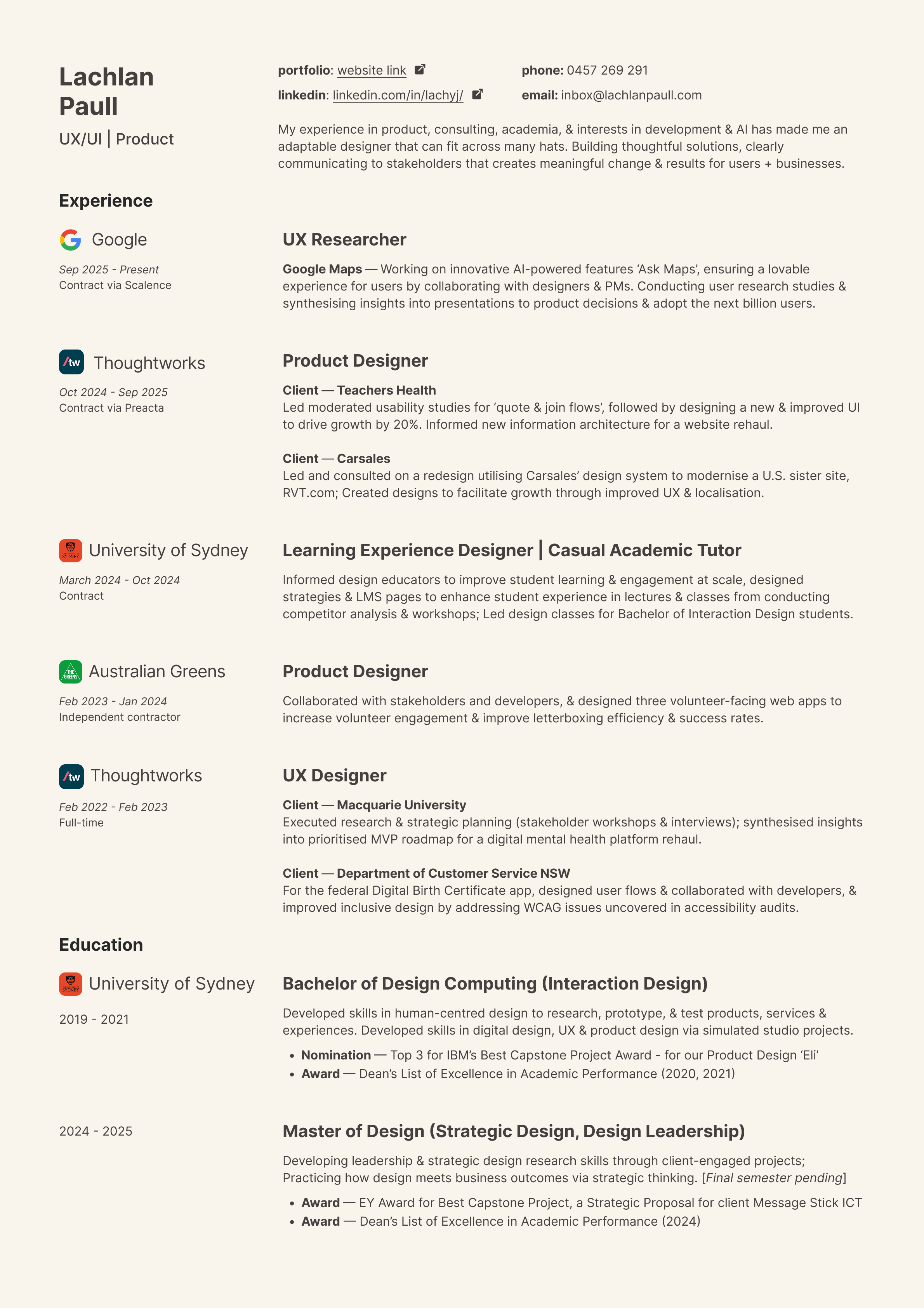 MDes (Strategic Design, Design Leadership) and BDes Computing (Interaction Design), University of Sydney — Dean's List on both; capstone awards on both.